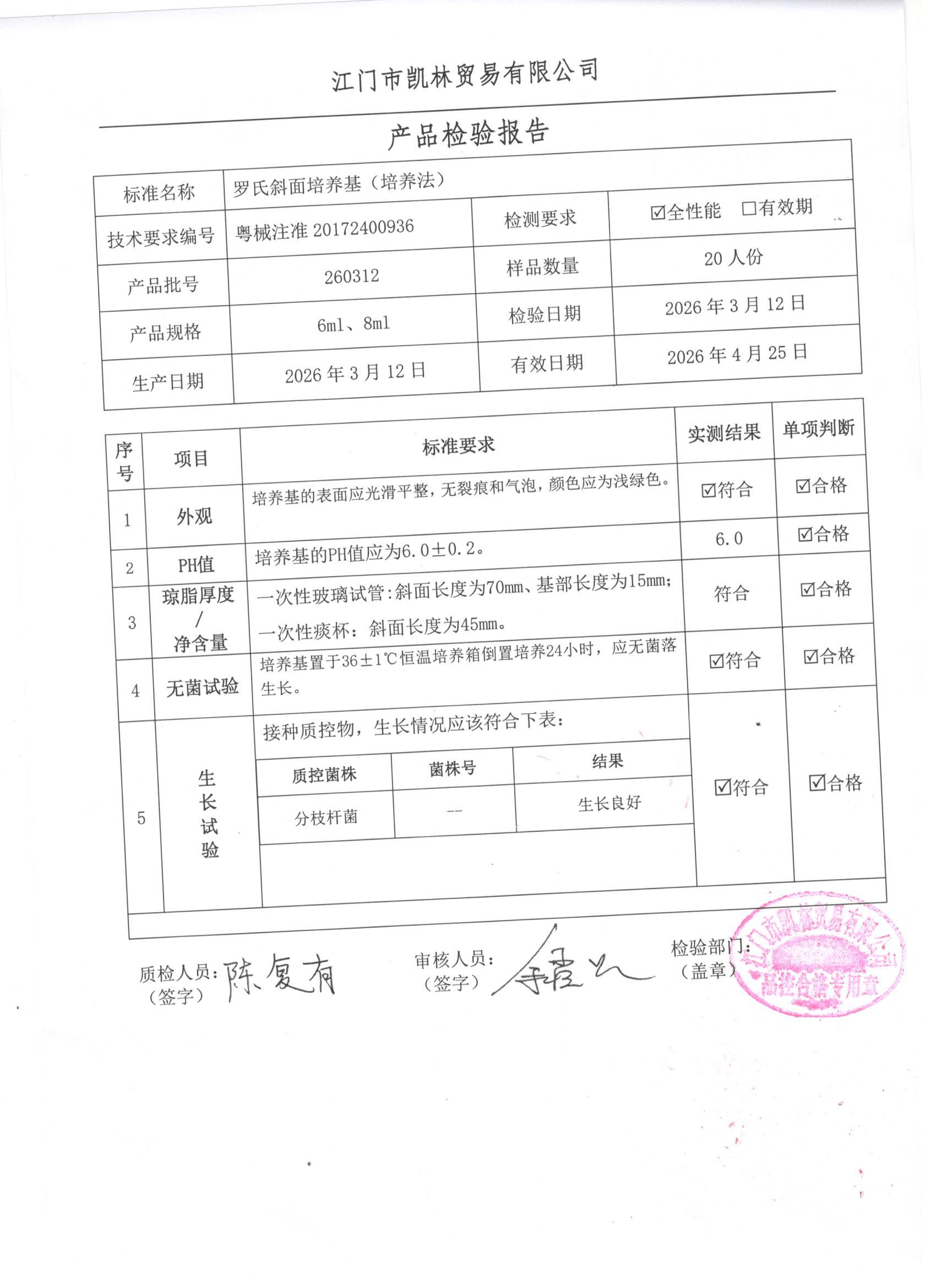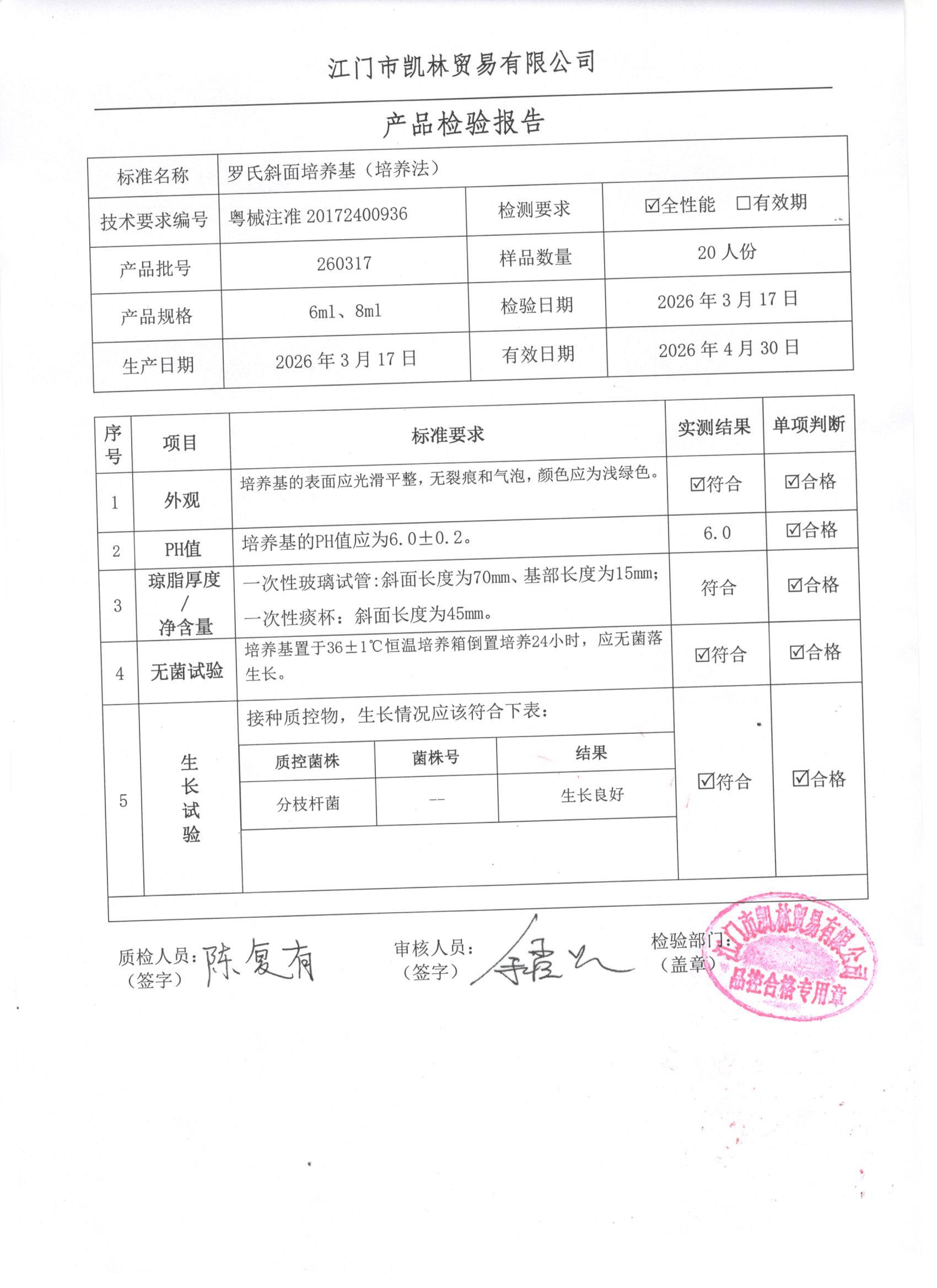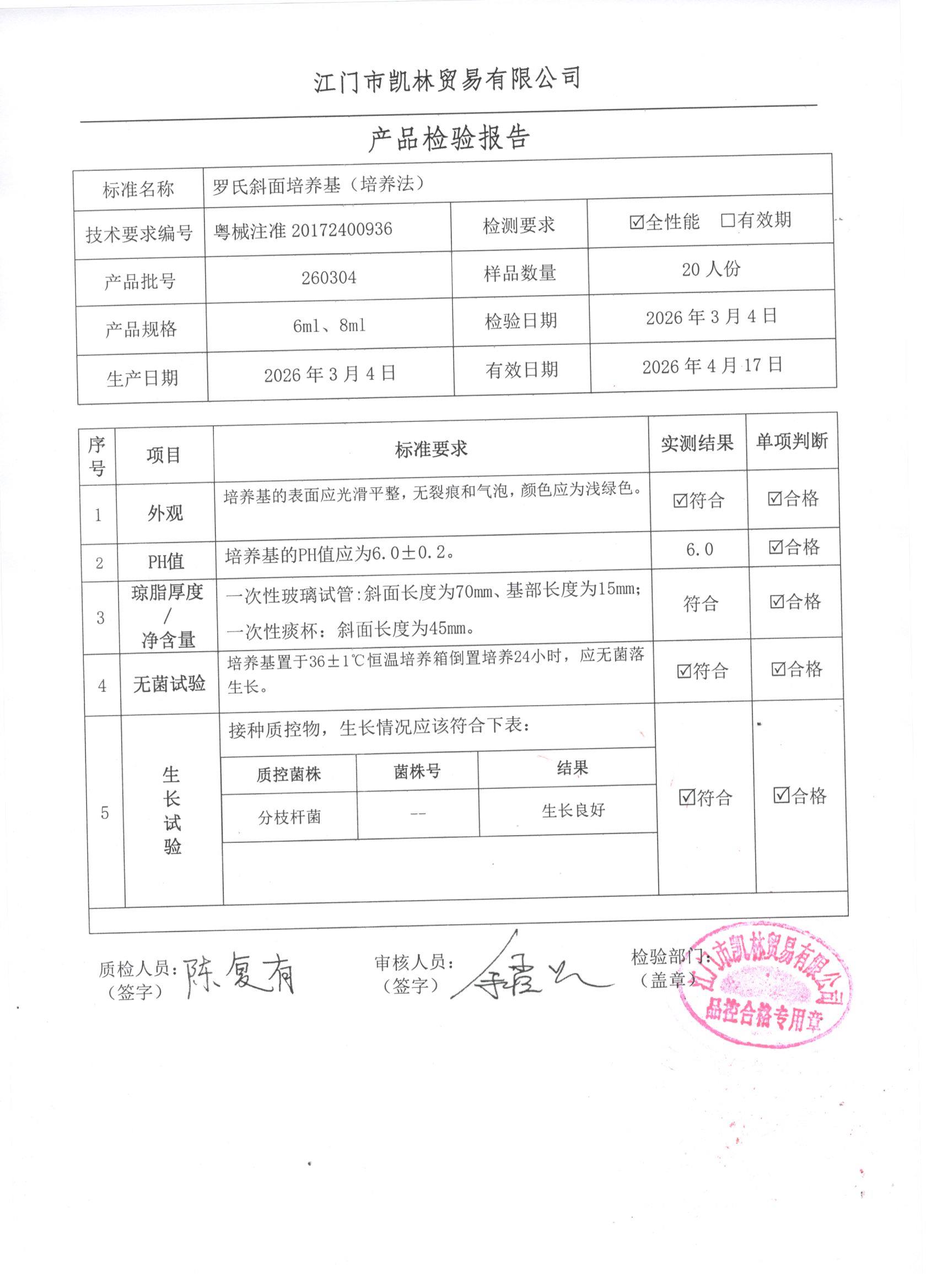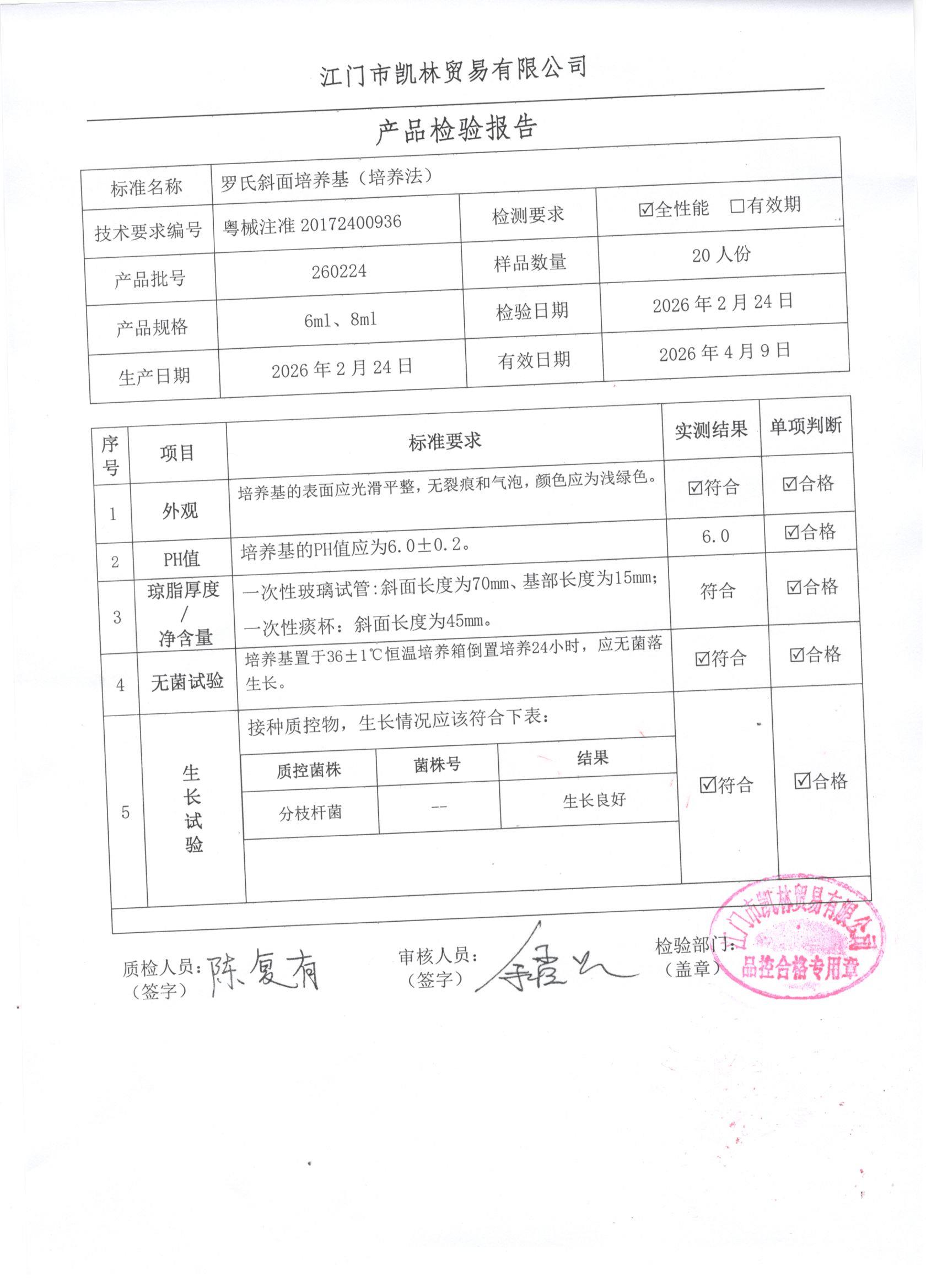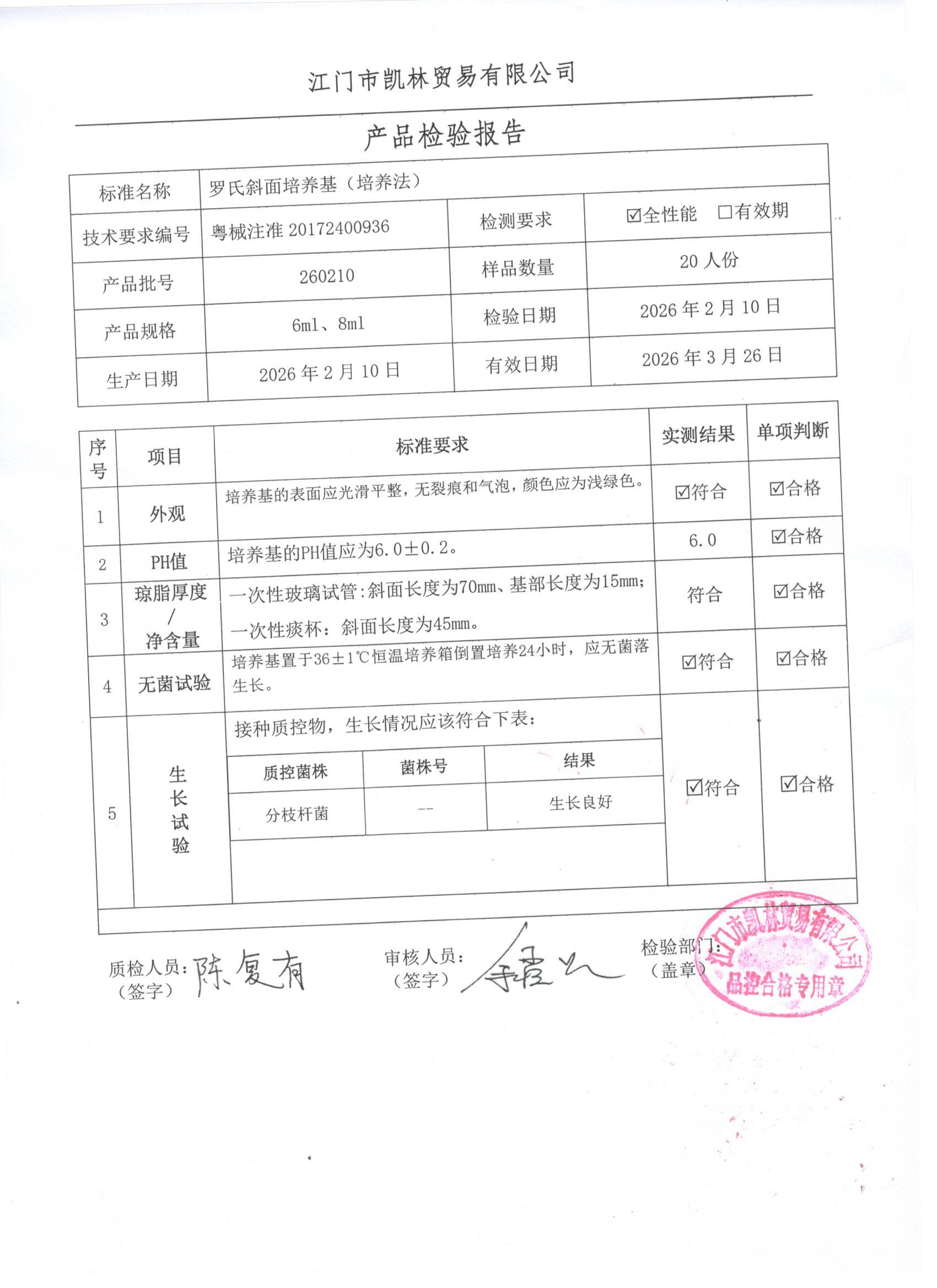 - 罗氏斜面培养基(培养法) 260317 6ml、8ml 江门凯林 下载文件