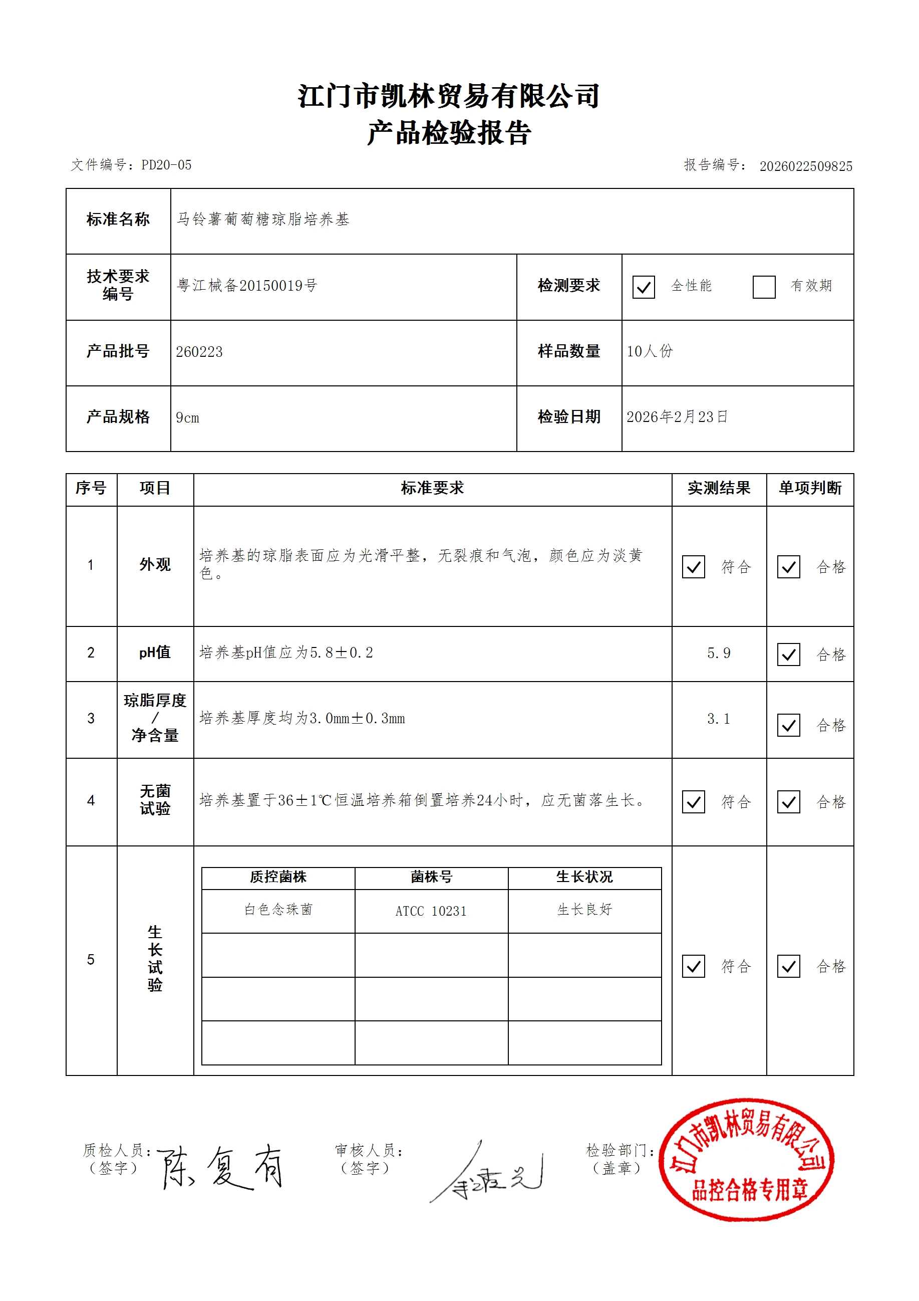 - 马铃薯葡萄糖琼脂培养基 260306 9cm 江门凯林 下载文件