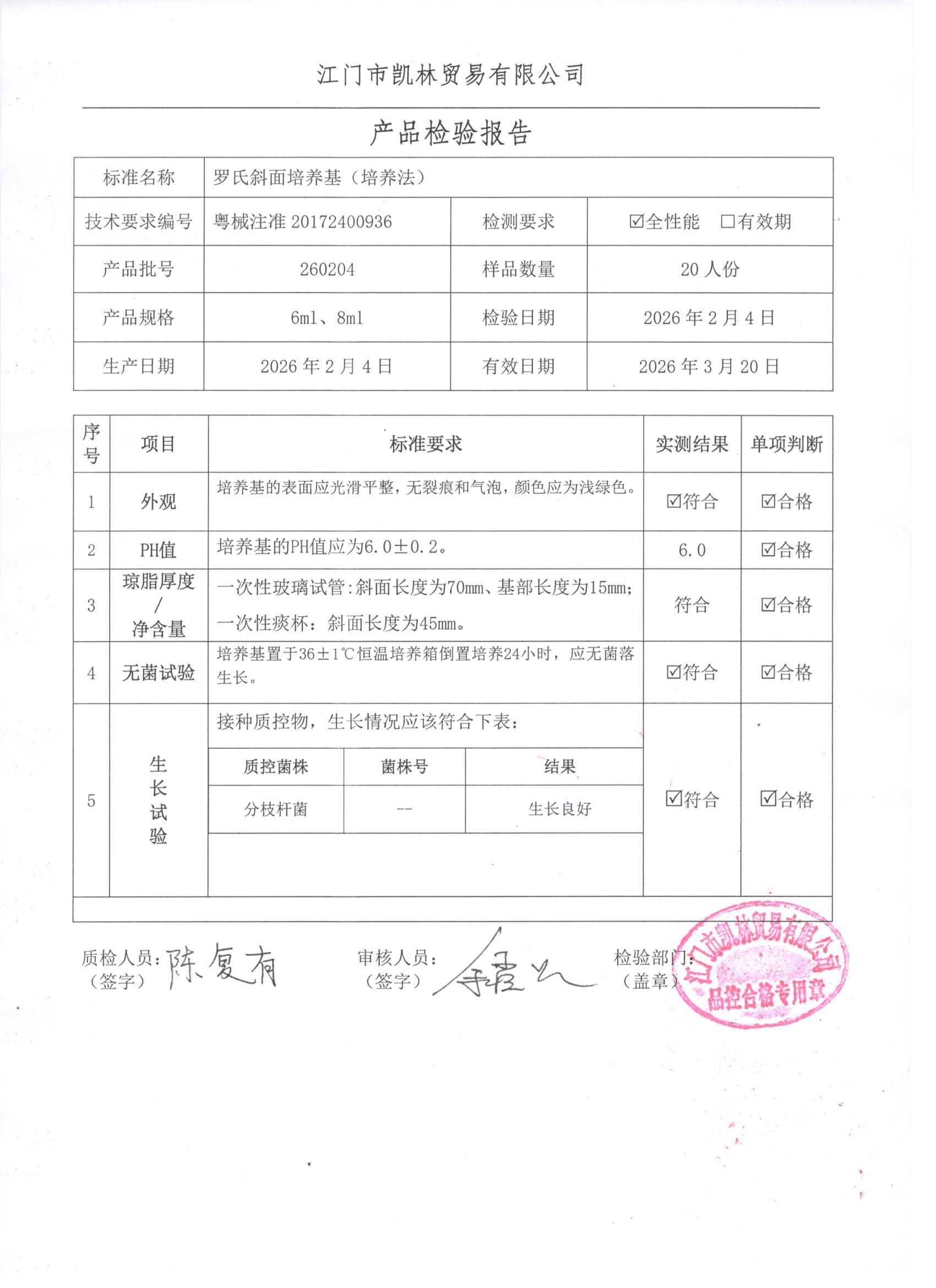 - 罗氏斜面培养基(培养法) 260224 6ml、8ml 江门凯林 下载文件