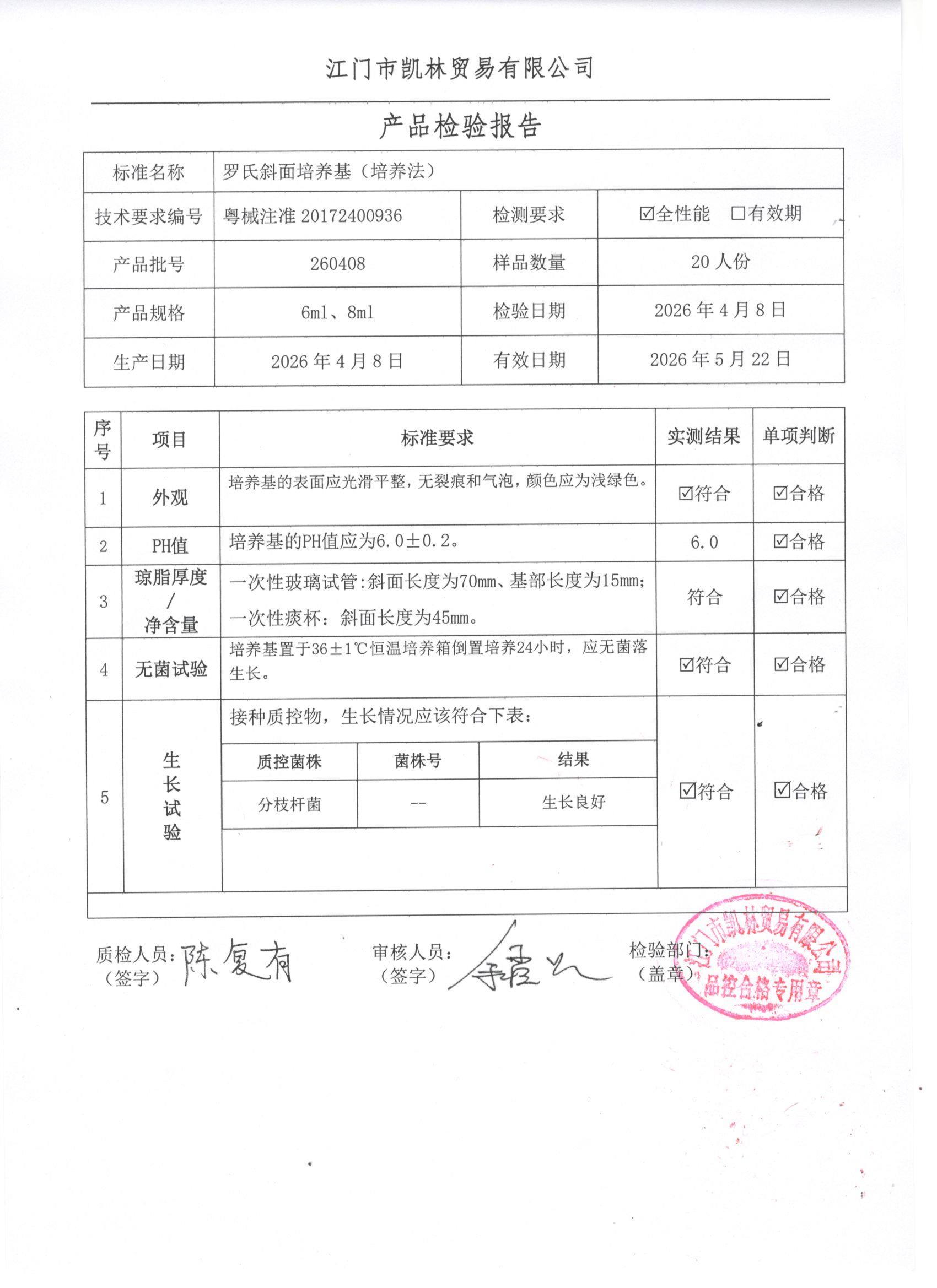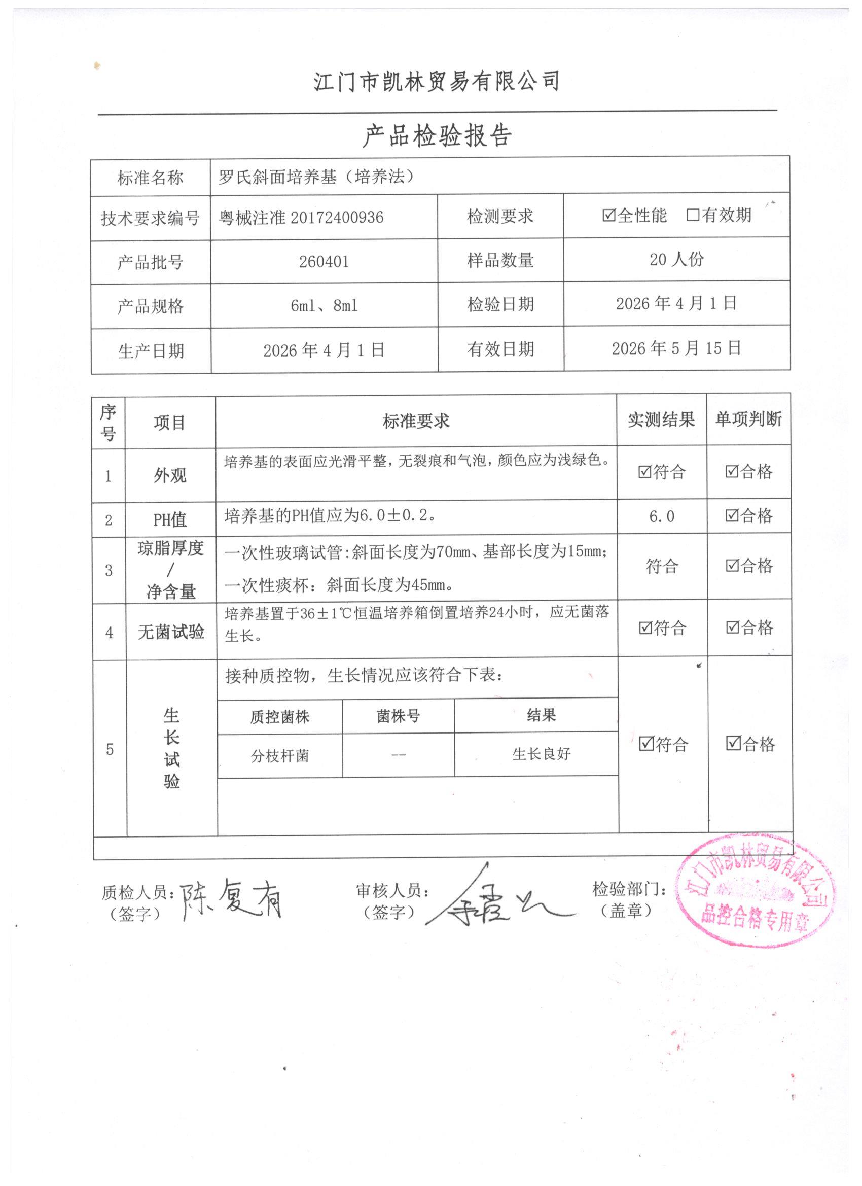 - 罗氏斜面培养基(培养法) 260408 6ml、8ml 江门凯林 下载文件